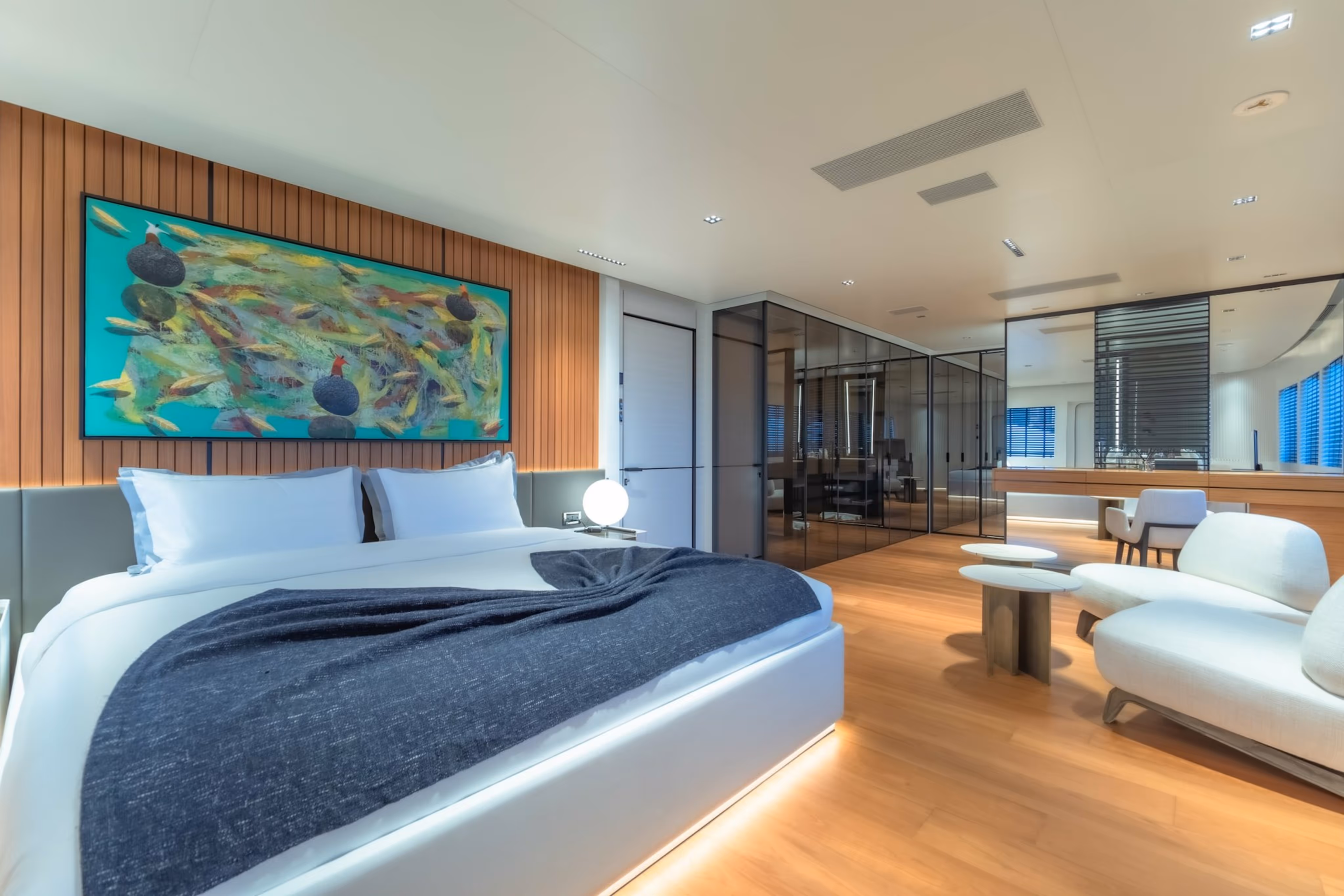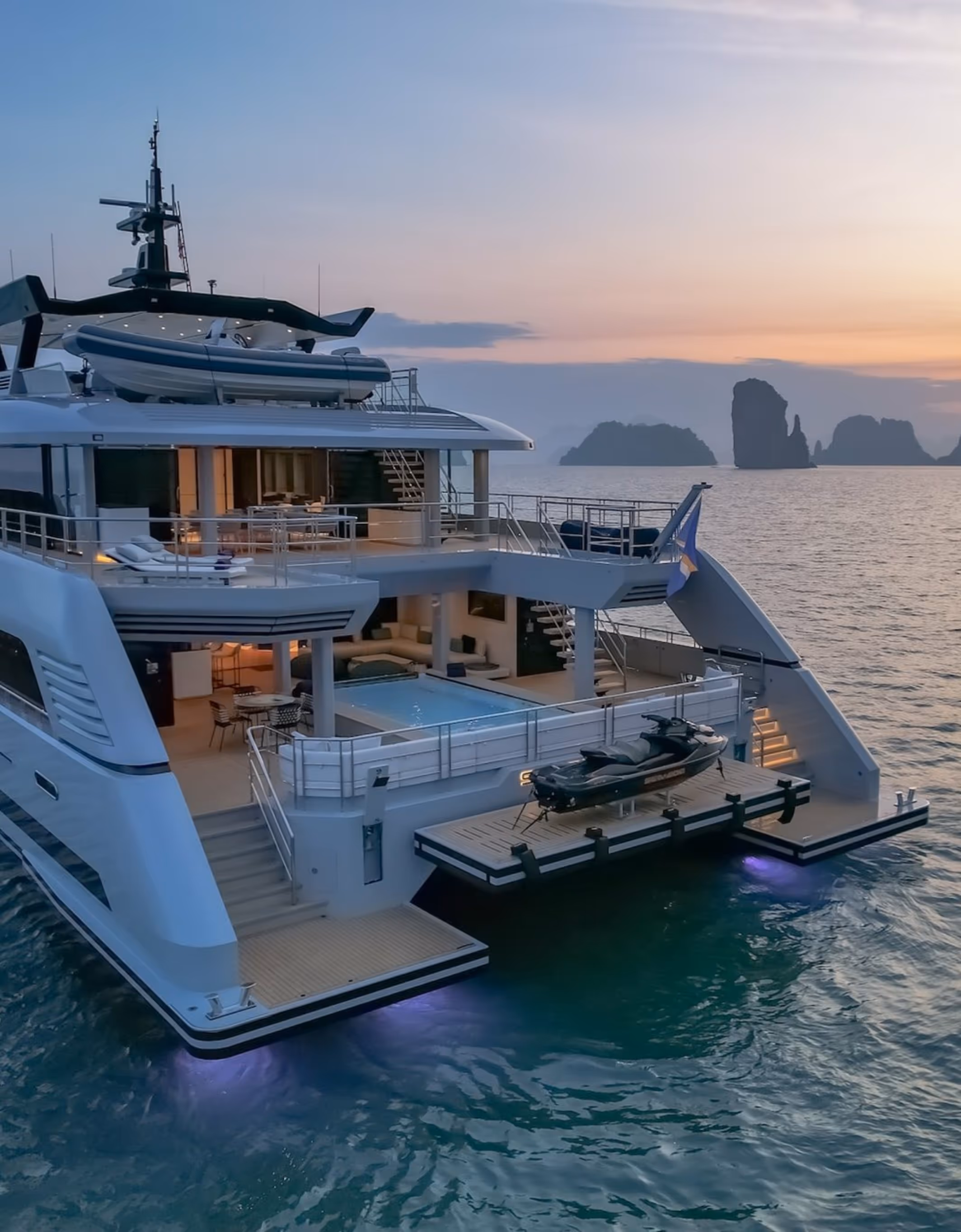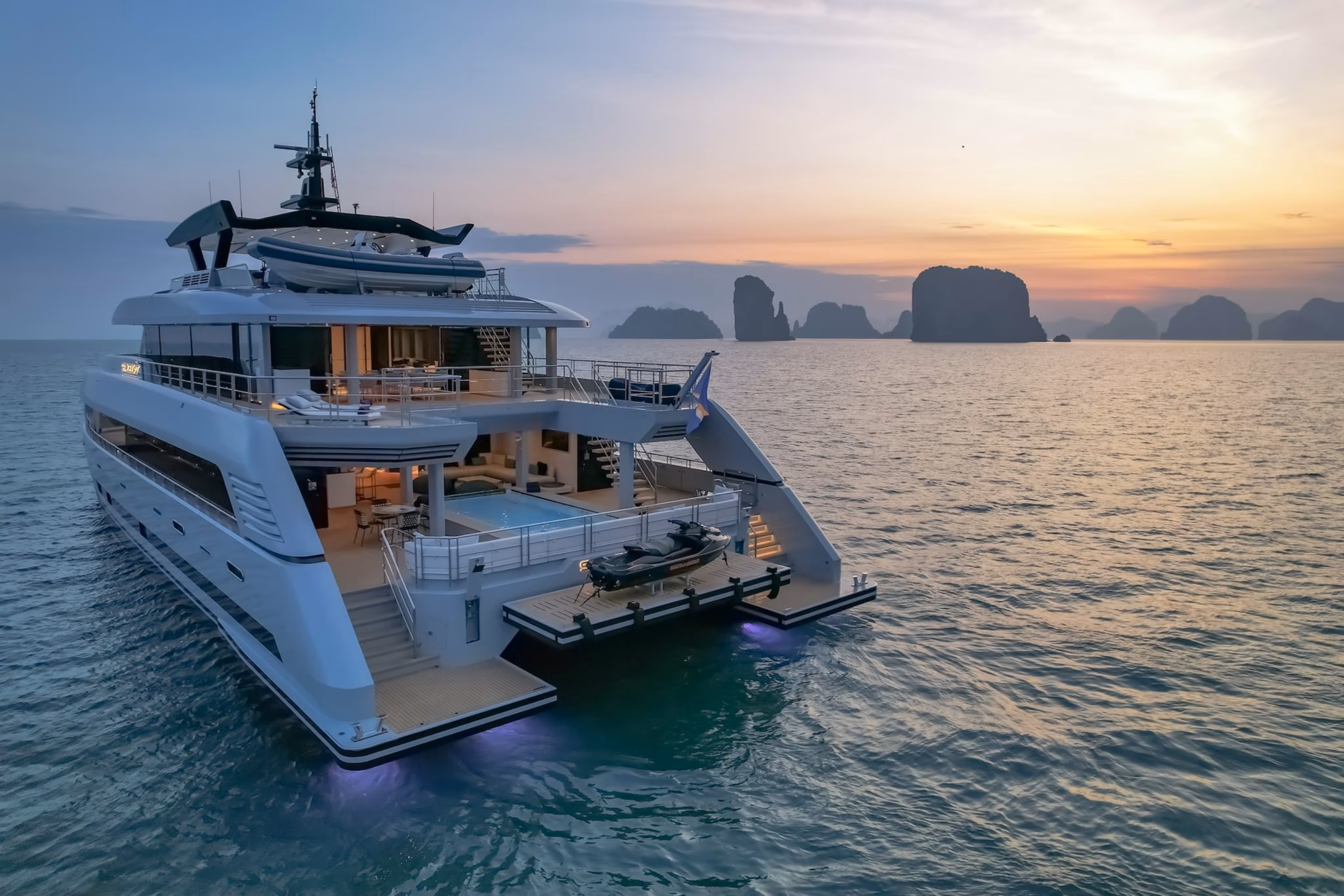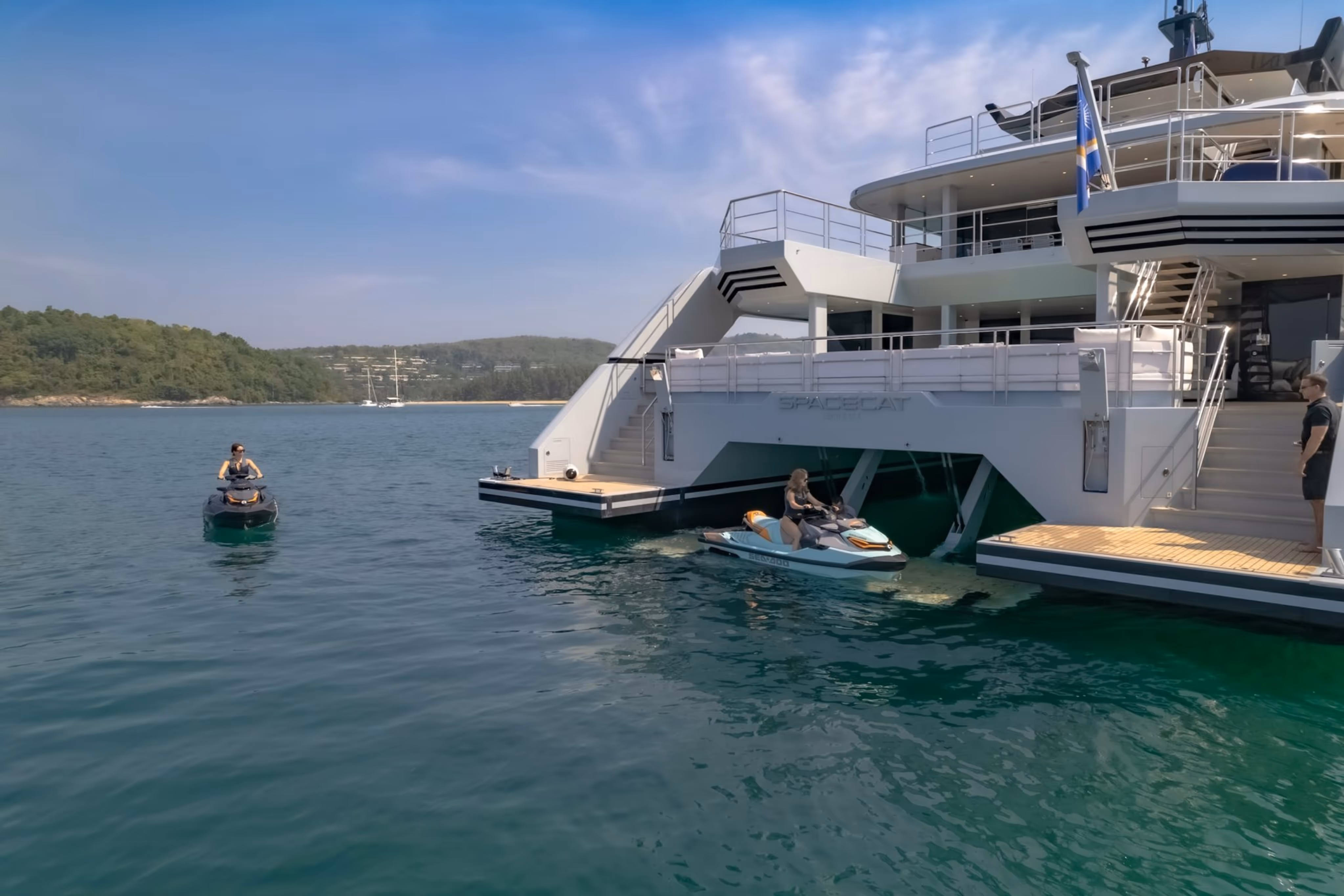 SpaceCat is a 35.9-meter aluminum power catamaran delivered in 2022 by SilverYachts and designed by the acclaimed Espen Øino. With her futuristic aesthetic, ultra-wide 13.3-meter beam, and efficient multihull platform, she offers unmatched stability, space, and fuel economy. Built entirely in aluminum, she sleeps 10 guests across 5 staterooms—including an owner’s suite on the main deck and two VIP and two twin cabins below—supported by a crew of 8. The minimalist, open-plan interior features panoramic glazing, a salon with 180° views, and elegant soft-tone furnishings. Outdoor areas include a main deck lounge with bar and dining, a sun deck with jacuzzi and bar, and a beach club with a hydraulic platform. A touch-and-go helipad sits on the bow. Powered by four Volvo Penta IPS 1050 engines, SpaceCat reaches a top speed of 21 knots and cruises efficiently at 10–15 knots, with a 3,000 nm range. Her shallow draft enables access to secluded anchorages, while her eco-conscious design makes her ideal for sustainable global cruising.