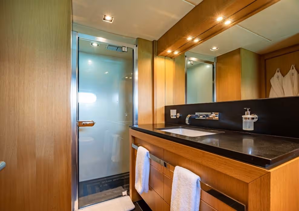 The yacht also provides accommodations for up to 6 crew members in four forward cabins, each equipped with heads featuring showers and washbasins.