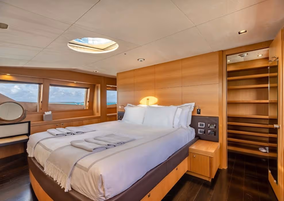 The master stateroom features wrap-around windows, a king-size bed, two walk-in closets, and a spacious en-suite with a shower and private WC.