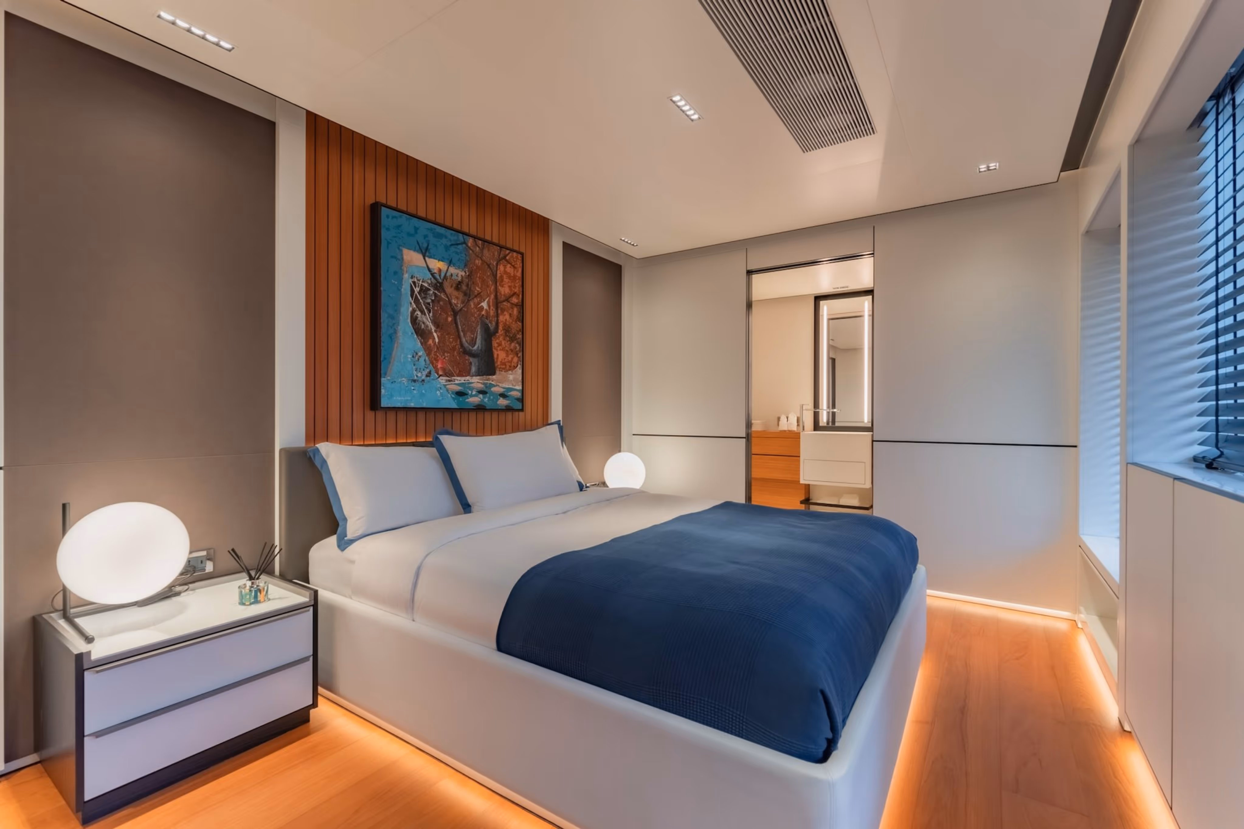 The SPACE CAT 36m offers a luxurious owner's suite designed for ultimate comfort and privacy. The suite features a spacious bedroom with a king-size bed, a private lounge area, and an en-suite bathroom equipped with premium fixtures and fittings. Large windows provide stunning panoramic views, ensuring a serene and relaxing environment.