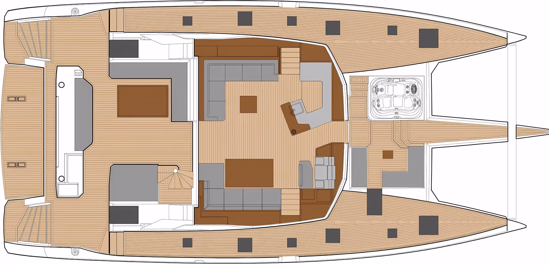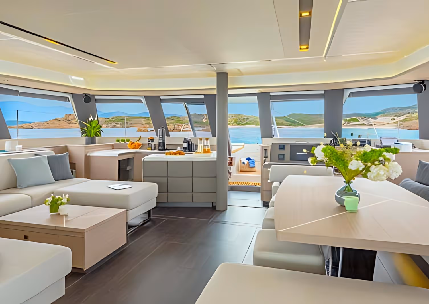 Brand new 67 feet catamaran, SEMPER FIDELIS accommodates 8 guests in 4 double cabins. For entertainment, SEMPER FIDELIS presents a range of activities, from sunbathing nets under the warm climate to a heated jacuzzi, perfect for enjoying the picturesque views. Equipment on board will also allow you to practice water skiing and wakeboarding, or even trips to beautiful beaches along the coast. The light tones and large glass surfaces of the saloon create a relaxing environment, highly aided by the luxurious sofa and juice bar areas of the saloon. A unique design features the galley located in the Babord hull and the table of the large aft cockpit can accommodate up to 10 guests.