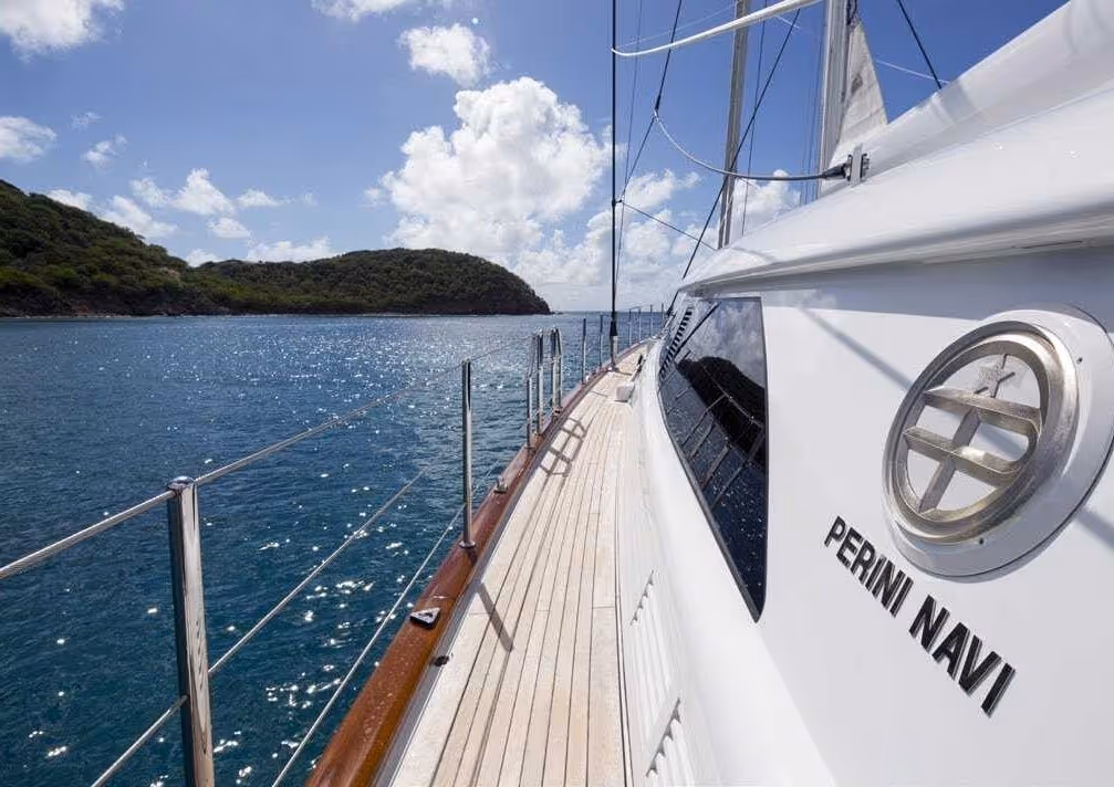 Her aluminium hull and superstructure give a displacement of up to 220 tons, new generation Perini Navi captive reel winches hold 12 tons, rewinding 35 metres of sheets per minute. She comes complete with Southern Spars carbon Hybrid Modulus mast and boom, EC6+ carbon fibre rigging controlled from the trademark. Perini hemi-spherical helm pod (all controllable by one person) and offers exceptional maneuverability.